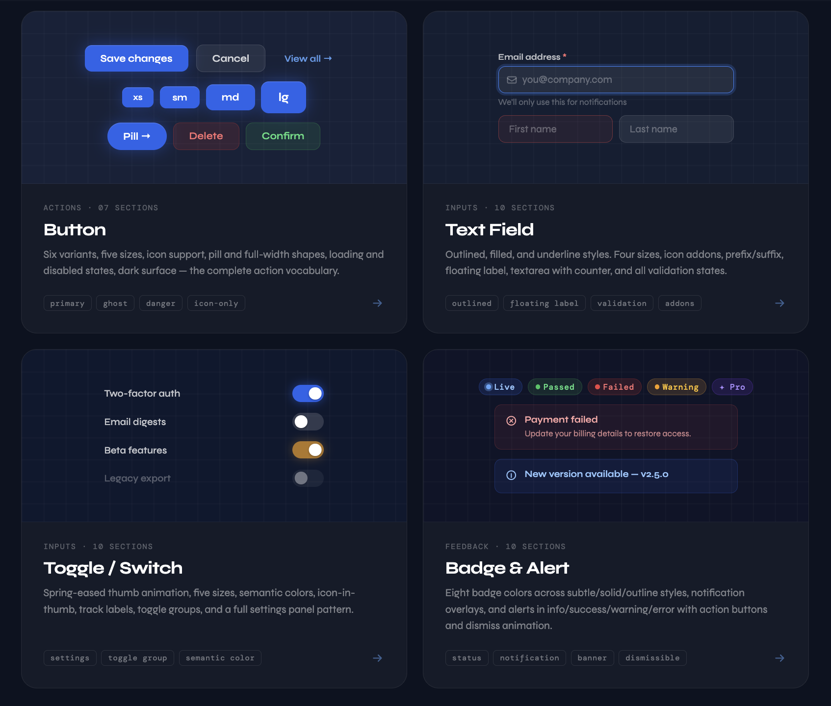 Every Meridian DS component page includes a real-world pattern section. The Toggle page's Settings Panel looks like an actual product screen. The Badge page's pipeline table looks like a CI/CD dashboard. The Alert page's inline variants show feedback living inside forms, not floating above them.