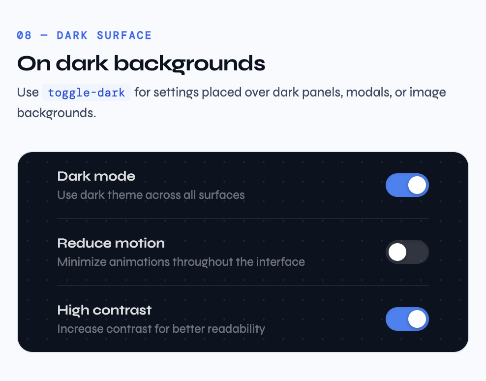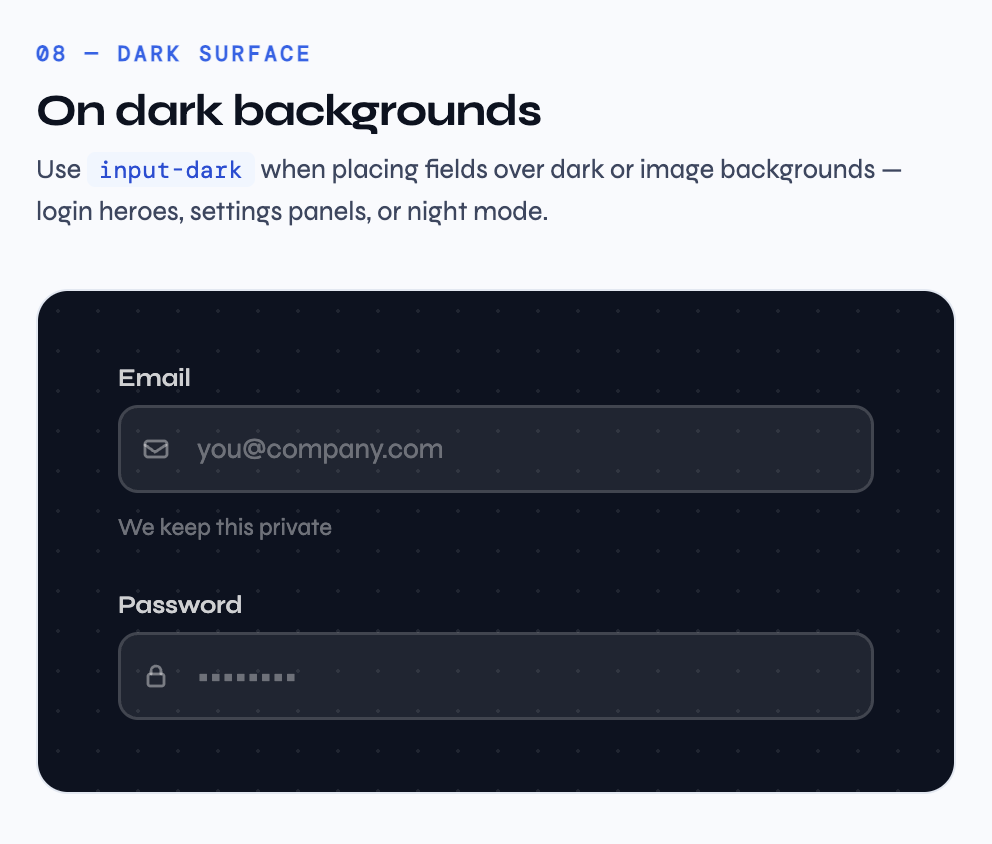 B2B SaaS users increasingly live in dark environments — IDEs, terminals, operator dashboards. A system that treats dark as second-class produces interfaces that feel like they don't belong there.