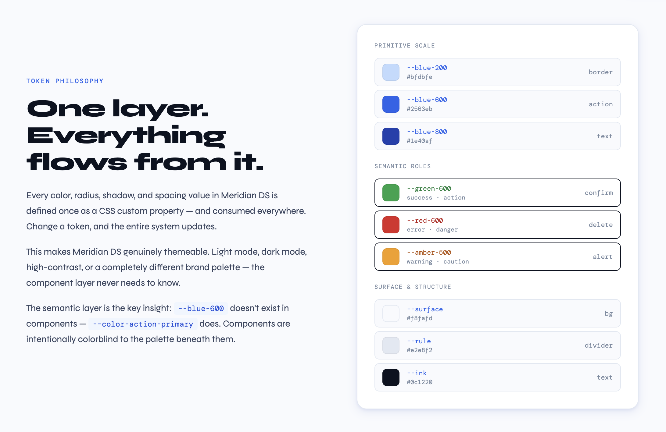 In Meridian DS, every color, radius, shadow, and spacing value is a named CSS custom property before it touches a component. A button doesn't know it's blue, it knows it's the primary action color. The token table in every component page isn't decorative. It's a contract between design and implementation.