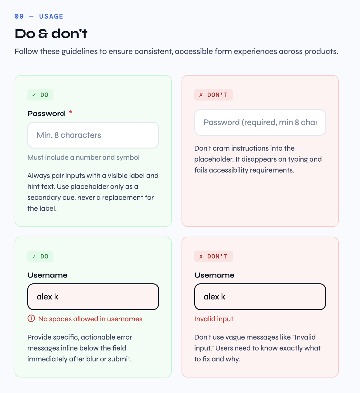 Every Meridian DS component page ends with a Do / Don't section — not as a checklist, but as an argument. The Text Field page argues that placeholder text is not a label replacement. The Alert page argues that stacking success alerts is wrong and Toast is the right tool for transient feedback.
