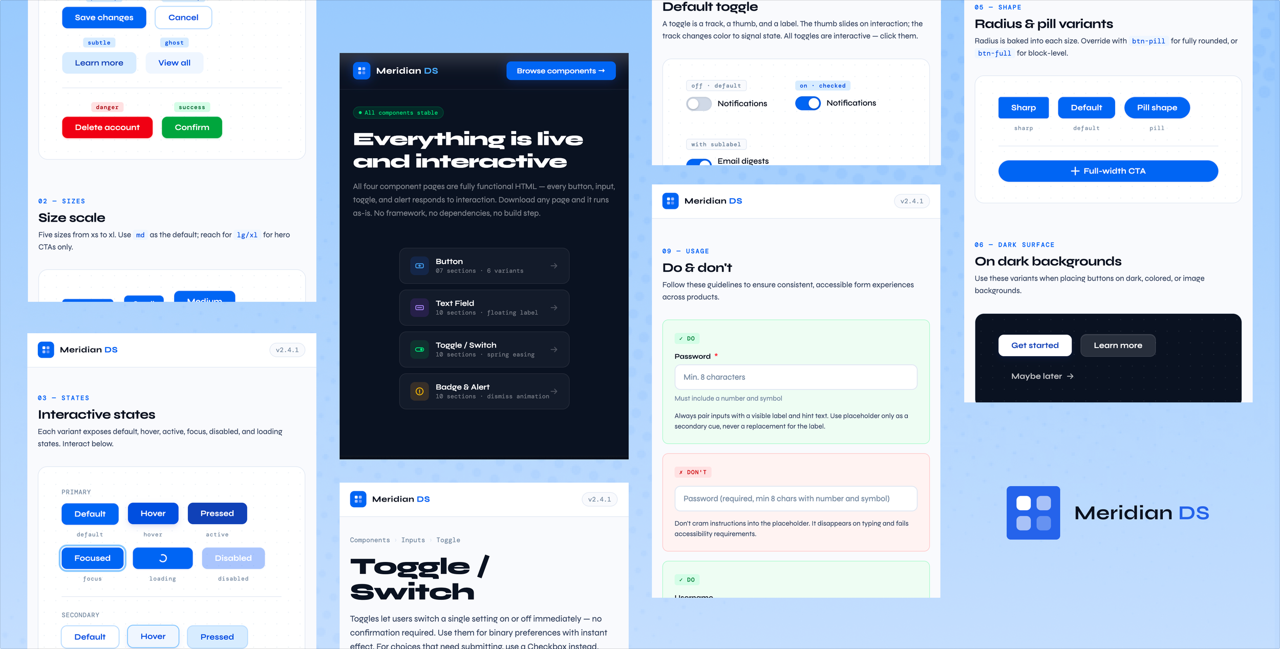 Meridian DS is deliberately incomplete. The current four components cover the foundational action and feedback vocabulary. On the roadmap: Select & Dropdown, Checkbox & Radio, Data Table, and a Color & Typography Foundations page.