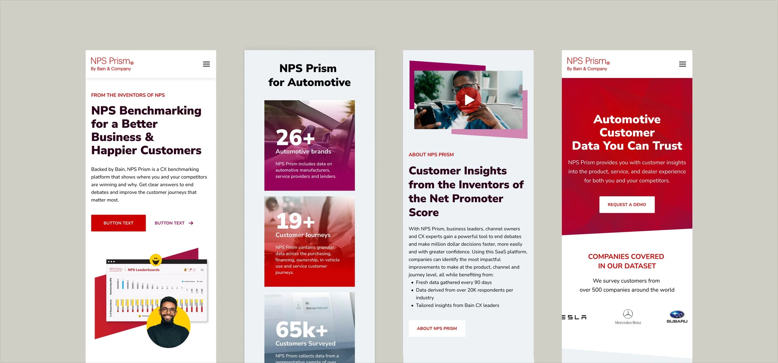 We ran biweekly leadership reviews to stay aligned with NPS Prism and Bain stakeholders. Feedback pushed us to prioritize early trust signals (like customer logos) and optimize CTAs for higher demo conversion. Fast iteration cycles helped sharpen messaging and structure at every stage.